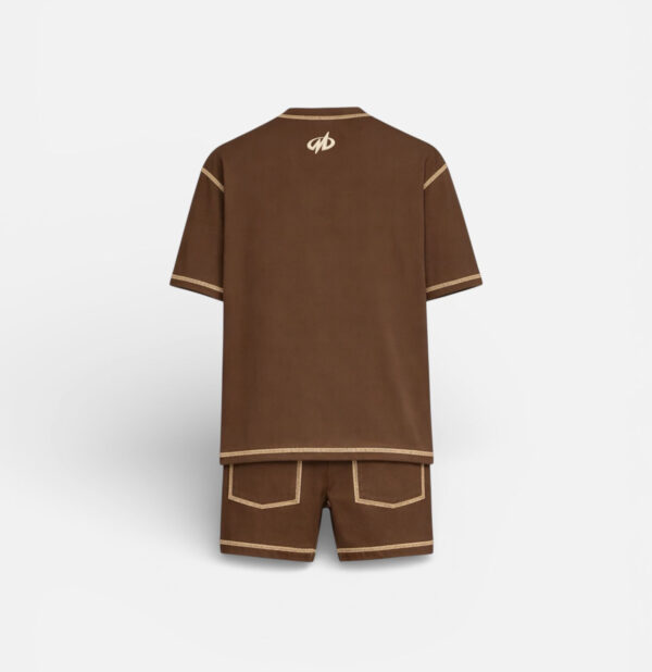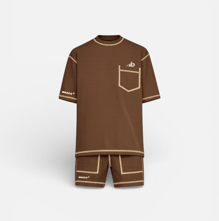 Het T-shirt heeft een comfortabele oversized fit met een borstzak detail, afgewerkt met sterke contraststiksels die de utility-stijl versterken. De bijpassende shorts zijn ontworpen voor dagelijks comfort en functionaliteit, met praktische zakken en een relaxed silhouet dat perfect past binnen de moderne streetwear scene.