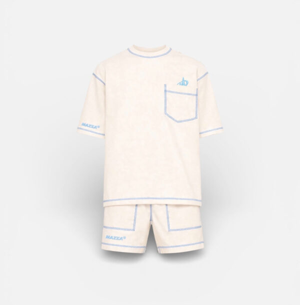 Het T-shirt heeft een comfortabele oversized fit met een borstzak detail, afgewerkt met sterke contraststiksels die de utility-stijl versterken. De bijpassende shorts zijn ontworpen voor dagelijks comfort en functionaliteit, met praktische zakken en een relaxed silhouet dat perfect past binnen de moderne streetwear scene.