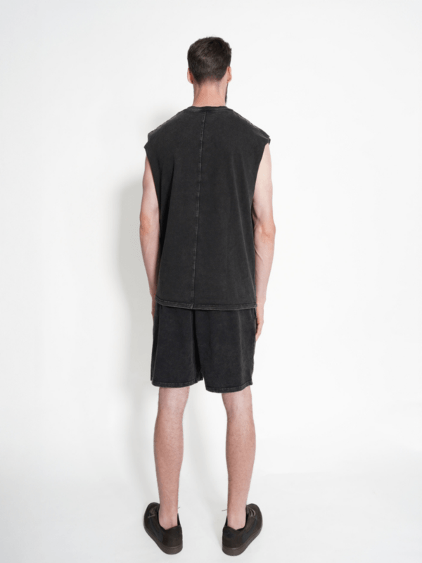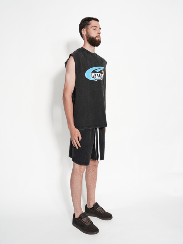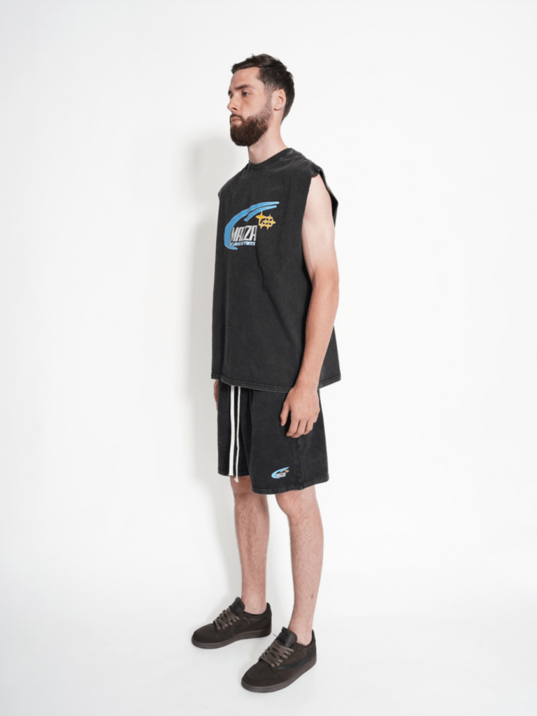 Deze comfortabele Mazza zomerset is perfect voor een relaxte, sportieve look. De set bestaat uit een mouwloos T-shirt en een basis short, uitgevoerd in een stijlvolle gewassen donkergrijze kleur met krachtige branding op zowel het shirt als de broek. De set is gemaakt van 100% katoen, wat zorgt voor een zacht, geweven en huidvriendelijk draagcomfort. Hierdoor is de outfit ideaal voor warme dagen, vrije tijd, sportieve activiteiten of gewoon casual dagelijks gebruik. De mouwloze top biedt extra bewegingsvrijheid, terwijl de short is voorzien van een elastische tailleband met trekkoord voor een verstelbare en comfortabele pasvorm