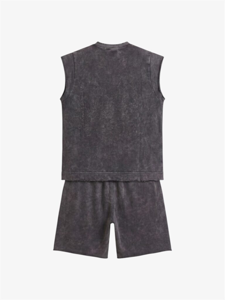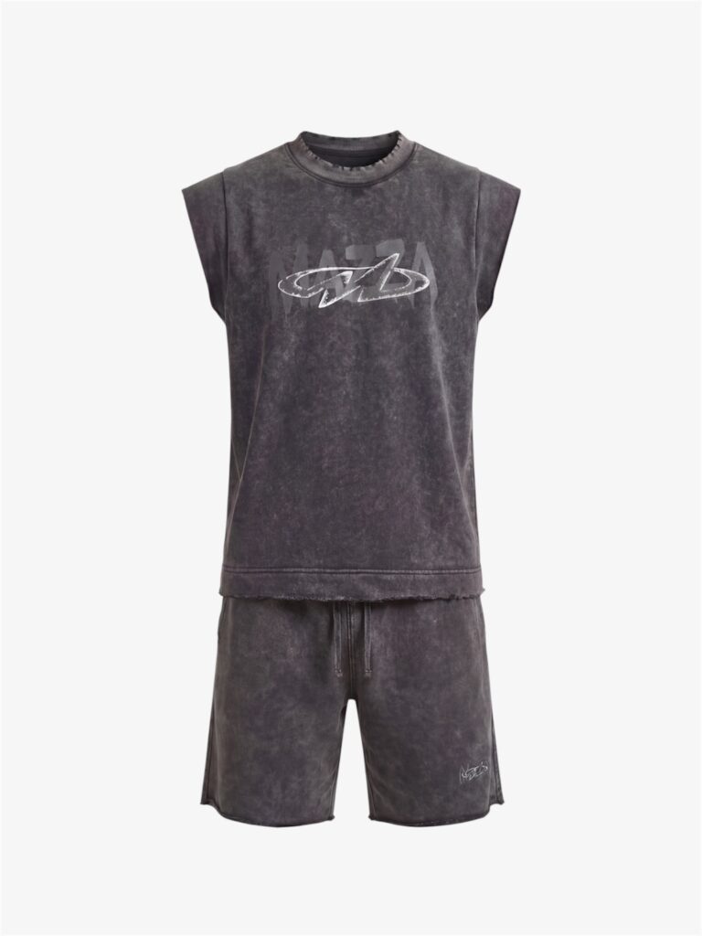De mouwloze top en bijpassende shorts zijn afgewerkt met subtiele distressed details en het MAZZA logo, wat de set een moderne en minimalistische street vibe geeft.