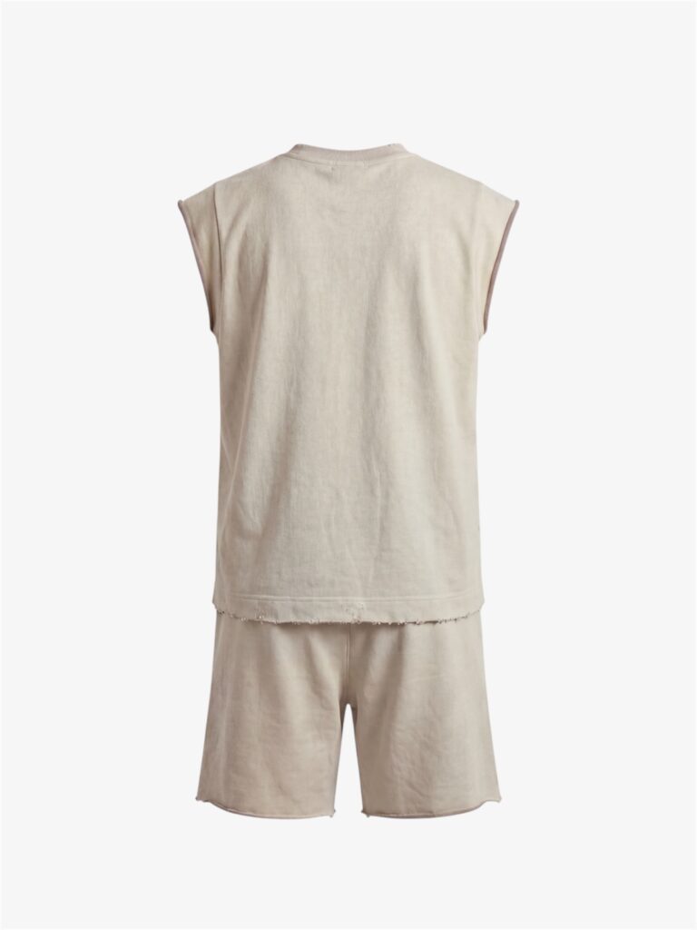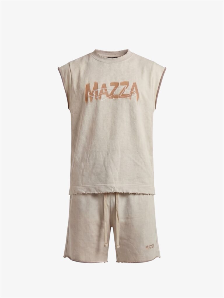 De mouwloze top en bijpassende shorts zijn afgewerkt met subtiele distressed details en het MAZZA logo, wat de set een moderne en minimalistische street vibe geeft.