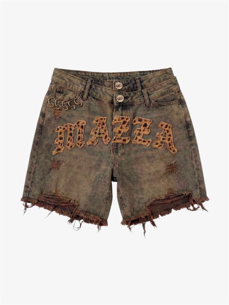De opvallende MAZZA patch op de voorkant zorgt voor een krachtige statement, terwijl de metalen ringdetails aan de zijkant een edgy en unieke touch toevoegen. De rafelige onderkant versterkt de ruige uitstraling en maakt het design compleet.