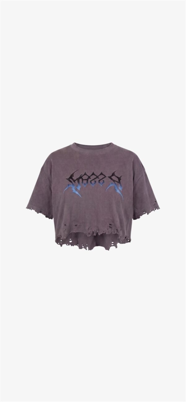 De opvallende MAZZA patch op de voorkant zorgt voor een krachtige statement, terwijl de metalen ringdetails aan de zijkant een edgy en unieke touch toevoegen. De rafelige onderkant versterkt de ruige uitstraling en maakt het design compleet.