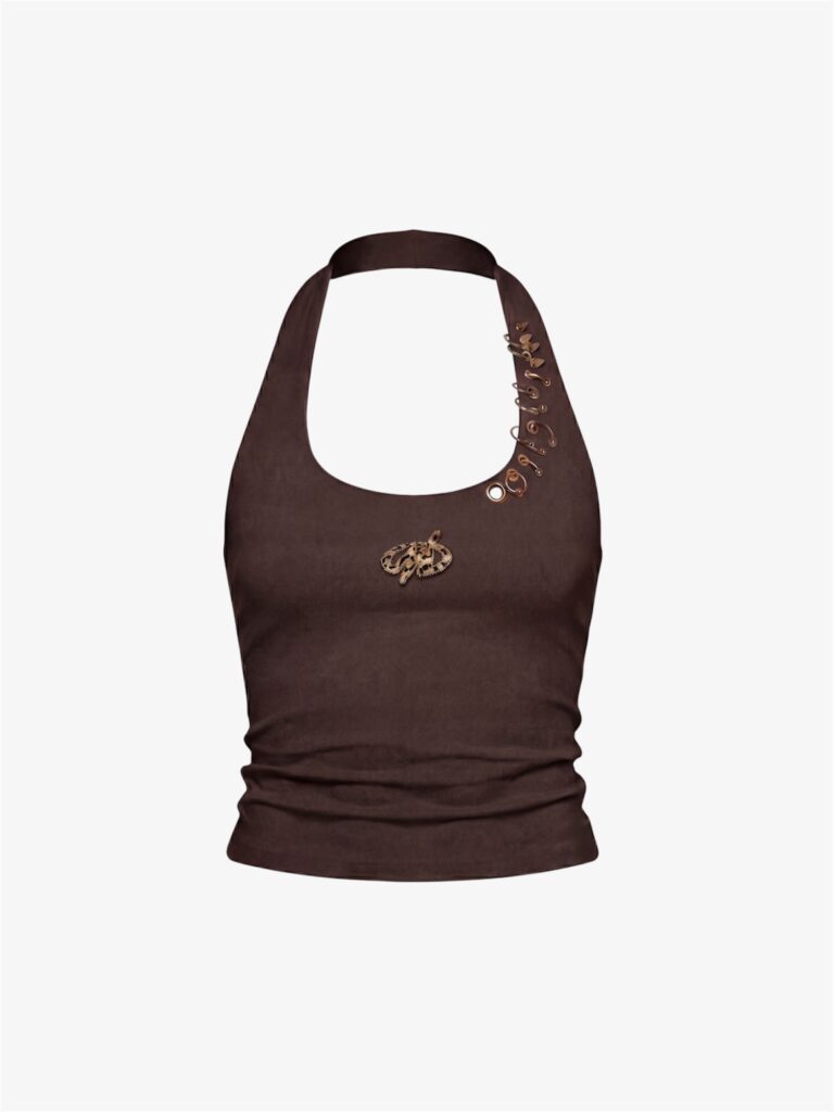 Een statement piece dat kracht en stijl combineert. Deze haltertop is ontworpen voor een strakke, moderne fit en geeft elke outfit een edgy streetwear uitstraling. De zachte bruine stof vormt zich comfortabel naar het lichaam, terwijl de gouden metalen details langs de schouder zorgen voor een opvallend en luxe accent.